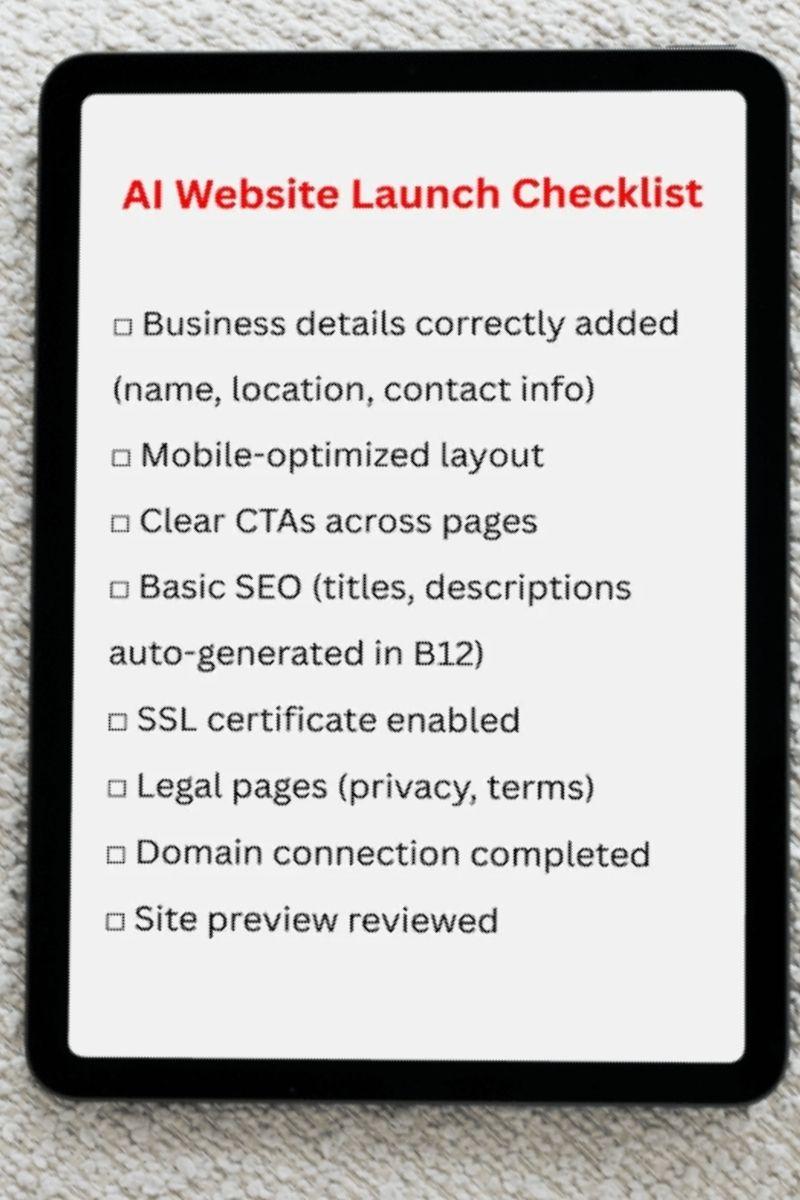 Tools like B12, an AI-powered website builder, handle most of the tricky stuff behind the scenes. That way, you can focus on getting your site up and running quickly, instead of chasing perfection. A quintessential AI website launch checklist helps you hit the "Go Live" button with confidence and fine-tune your site later to enhance user experience and search engine rankings even while online.